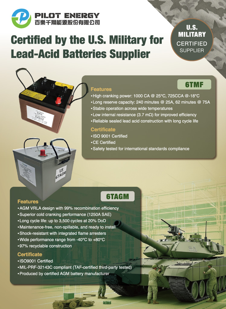 台灣宜蘭 – 2023年2月 – 百樂千翔能源股份有限公司(Pilot Energy Co., Ltd.),身為能源產業的領導者與美軍、國軍長期合作的認證廠商,正式推出 6TMF 加水後免維護軍用電池 與 6TAGM 高功率 VRLA AGM 啟動電池。這兩大軍規級型號,專為軍用卡車、戰術車輛與重型設備設計,具備 高效率、穩定、安全 的特性,能在嚴苛環境中提供最可靠的啟動與電力支持。